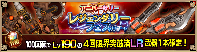 100回転で4回限界突破済LR武器確定!「アニバーサリーレジェンダリーフェスガチャ」登場! -